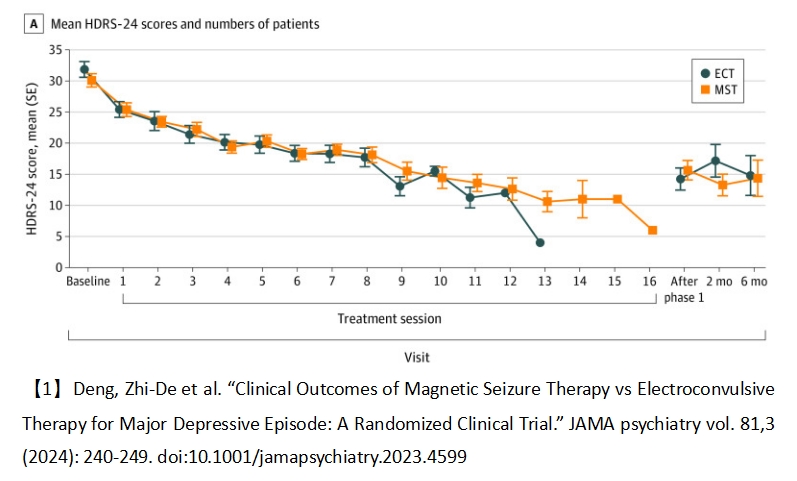 JAMA Psychiatry雜志上的一項雙盲對照試驗,表明完成研究的患者中,MST組與ECT組(6倍癲癇發(fā)作閾值)有效率(減分≥50%)分別為58.6%和62.5%,治愈率(減分≥60%,且≤8分)分別為44.8%和41.7%,組間均無顯著差異。急性期治療2個月及6個月后,MST與ECT抗抑郁療效得以維持,兩組無顯著差異[1]。