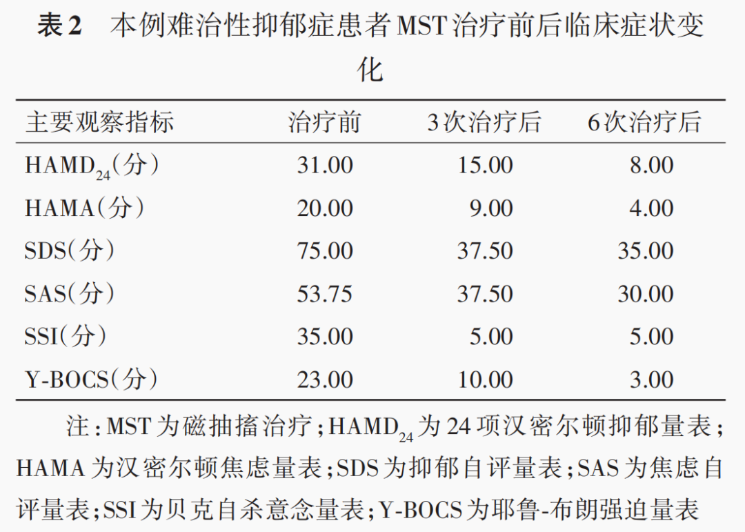 MST治療前后主要觀測指標(biāo)見表2,且認(rèn)知功能未見明顯減退。患者行MST后1個月回到我院復(fù)診,進(jìn)行了臨床評估(HAMD24評分13分,HAMA評分10分,Y-BOCS評分5分)。在此次復(fù)診結(jié)束后,患者因疫情原因未能按時線下復(fù)診(治療結(jié)束后2個月),對患者進(jìn)行了線上電話隨訪(HAMA評分15分,HAMD評分15分,Y-BOCS評分3分)。在隨后半年的門診復(fù)診中,患者情緒癥狀平穩(wěn)(HAMA評分8分,HAMD評分5分),反復(fù)檢查等強迫癥狀未再出現(xiàn),患者目前繼續(xù)從事教育工作。