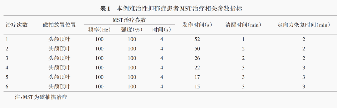 于2022年10月27日至2022年11月3日,8天內(nèi)共完成6次100Hz的高頻MST治療(除周六、日外,1次/天),MST治療采用武漢依瑞德MagSuper治療儀及圓形線圈(直徑120mm),以100Hz的頻率、100%的刺激強度進(jìn)行治療,在治療前測量患者的運動閾值,并采用滴定法來確定磁刺激的時間:通常以4s開始,若患者的抽搐發(fā)作持續(xù)時間小于15s,在下一次的治療中,刺激時間可逐漸增加1~2s(最多10s)進(jìn)行優(yōu)化,治療部位根據(jù)國際標(biāo)準(zhǔn)腦電電極10-20導(dǎo)聯(lián)系統(tǒng)進(jìn)行定位,選擇Cz點進(jìn)行治療(既往研究認(rèn)為Cz可有效誘發(fā)抽搐發(fā)作)每例患者建立靜脈通路后均給予丙泊酚(1.25mg/kg)和琥珀酰膽堿(0.5mg/kg)用于麻醉誘導(dǎo)和肌肉松弛。