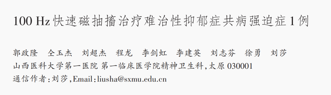 ? 參考文獻(xiàn):郭政隆,仝玉杰, 劉超杰, 等. 100 Hz快速磁抽搐治療難治性抑郁癥共病強迫癥1例[J]. 中華精神科雜志,2024, 57(1): 42-46. DOI: 10.3760/cma.j.cn113661-2023-0809-00027.