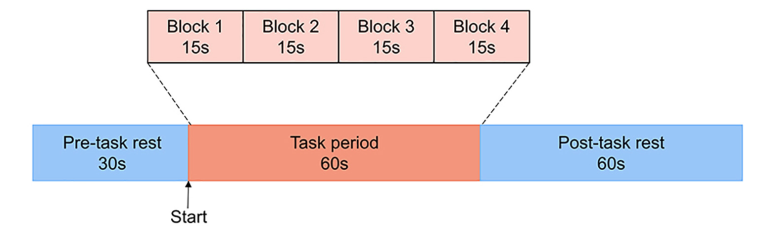 如圖一:每個試驗(yàn)包括30秒的任務(wù)前休息期,60秒的任務(wù)期,最后是60秒的任務(wù)后休息期。任務(wù)前后根據(jù)提示數(shù)數(shù),任務(wù)期被試分別用上、時、說、家四個字組詞,每個字15秒,任務(wù)期組詞越多越好。