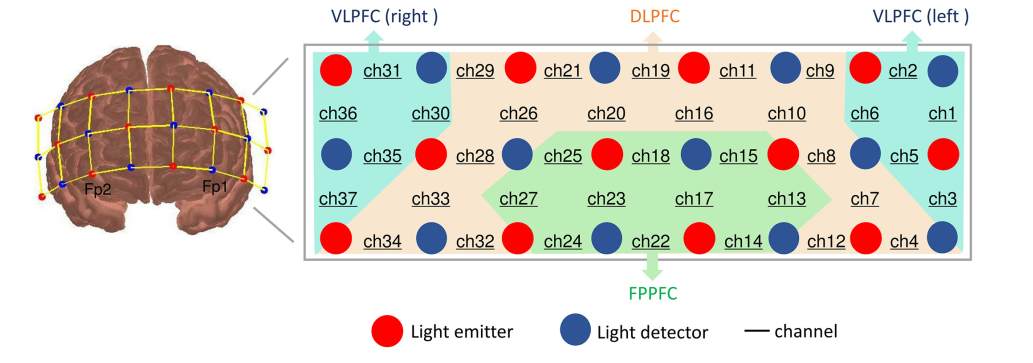 采用由武漢資聯(lián)虹康科技股份有限公司生產(chǎn)的37通道BS-3000近紅外腦功能成像系統(tǒng)測量大腦皮層中HbO和HbR的濃度變化。每個通道的距離為3厘米。采樣率設(shè)置為20Hz。