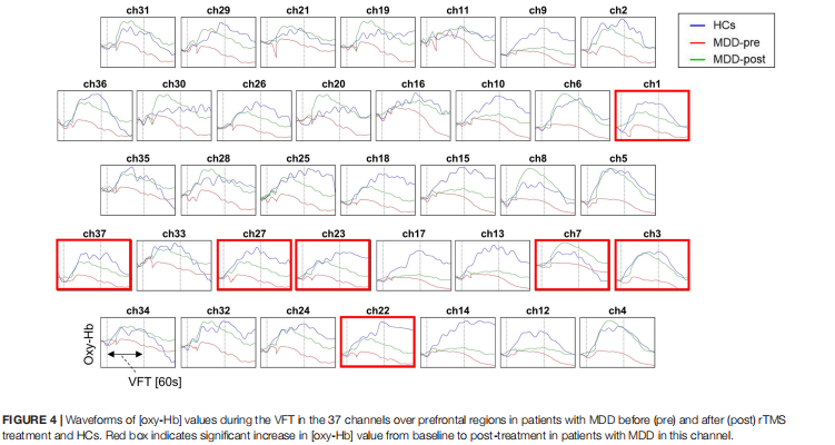 ? 使用Wilcoxon檢驗(yàn)比較了MDD組治療前和治療后各通道VFT期間HbO值的差異,評估抑郁癥患者對經(jīng)顱磁刺激治療的HbO反應(yīng);
