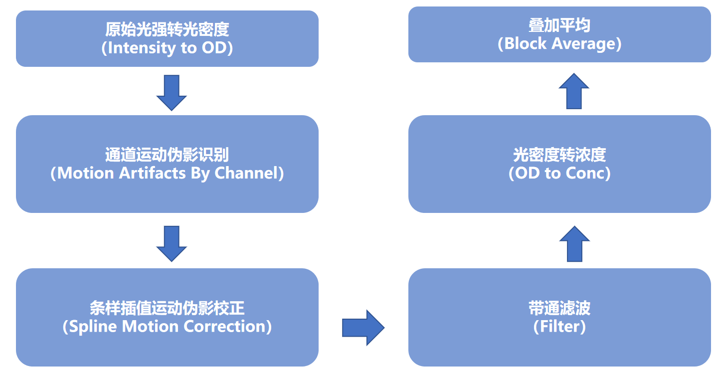運(yùn)用Matlab軟件中的Homer2模塊進(jìn)行分析,取任務(wù)前10s作為基線期,先將原始光強(qiáng)轉(zhuǎn)化為光密度,使用0-0.1Hz的帶通濾波器對原始數(shù)據(jù)進(jìn)行濾波,以去除高頻噪聲;然后采用條樣插值方法去除運(yùn)動偽影;最后運(yùn)用比爾朗伯定律將光密度轉(zhuǎn)化為HbO濃度。具體流程如圖三。