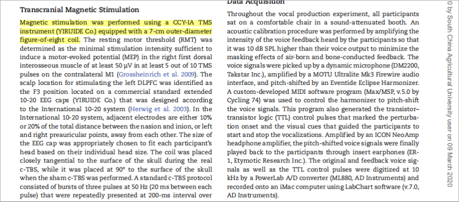 2017年,應(yīng)用CCY-IA型機(jī)發(fā)表在Brain Stimulation(IF=6.12)上的“Effects of Theta Burst Stimulation on Suprahyoid Motor Cortex Excitability in Healthy Subjects”等等。