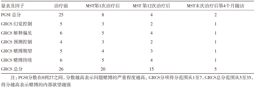 2.使用問(wèn)題賭博嚴(yán)重指數(shù)(PGSI)評(píng)估過(guò)去一年內(nèi)問(wèn)題賭博的嚴(yán)重程度。分?jǐn)?shù)分為“非問(wèn)題賭徒”(0分)、“低風(fēng)險(xiǎn)”(1~4分)、“中風(fēng)險(xiǎn)”(5~7分)和“問(wèn)題賭徒”(8分以上)?;颊咴谥委熐?、第1次MST治療后、第12次MST治療后和4個(gè)月后均使用PGSI進(jìn)行自我報(bào)告評(píng)估。