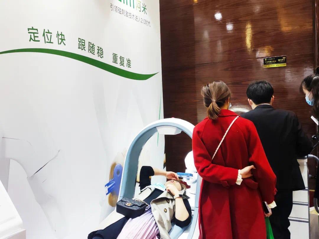 與會人員參觀阿米 其中,阿米磁刺激智能機器人系統吸引了眾多專家同仁的目光。阿米融合了人工智能等前沿技術,能有效解決TMS線圈的初始定位繁瑣、過程定位偏移、重復定位不準等眾多臨床應用問題,并有效保障TMS臨床和科研數據的客觀性。