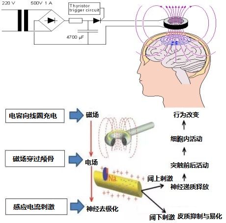 磁刺激(MS)是一種基于電磁感應(yīng)與電磁轉(zhuǎn)換原理,利用線圈內(nèi)的瞬變電流產(chǎn)生的強磁場穿透顱骨或骨骼的神經(jīng)刺激技術(shù)。作用于頭部的稱為經(jīng)顱磁刺激(TMS),作用在頭部以外的區(qū)域稱為功能磁刺激(FMS ),MS在中樞神經(jīng)系統(tǒng)內(nèi)產(chǎn)生的感應(yīng)電流可引發(fā)一系列生理、生化反應(yīng),進而發(fā)生功能和行為改變來達到治療的目的(圖1)。