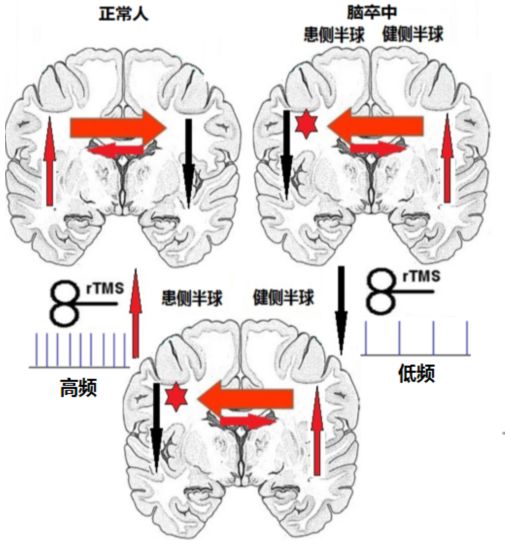 人類左、右半球間進化的不對稱性,左半球為優(yōu)勢半球,兩半球之間通過“經(jīng)胼胝體抑制”機制維持著一種恒定的彼此抑制關(guān)系,左半球?qū)τ野肭蛴休^強的抑制。當一側(cè)半球損害興奮性降低時,則不能抑制對側(cè)半球,使對側(cè)半球過度興奮,并反向抑制患側(cè)半球,加劇患側(cè)半球損害,rTMS治療需要利用半球間競爭機制,通過低頻抑制健側(cè)半球M1區(qū)和/或高頻興奮患側(cè)半球M1區(qū)(圖3)。健側(cè)半球低頻刺激在可在急性、亞急性期即可開始治療,患側(cè)半球高頻刺激通常在亞急性期開始。