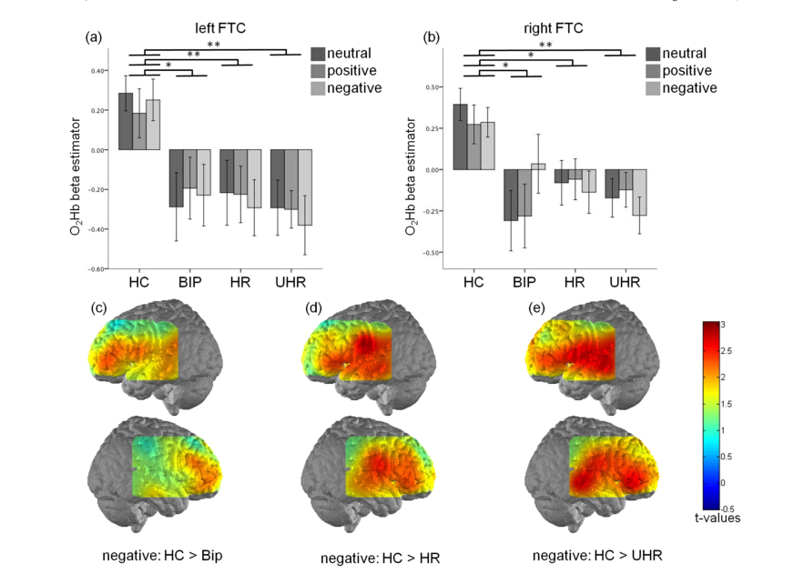 本項(xiàng)研究的目的是通過前額葉和額顳葉的大腦活動,研究精神分裂風(fēng)險(xiǎn)個體和雙相情感障礙風(fēng)險(xiǎn)個體在情緒配價(jià)和中性詞匯的加工過程。與HC相比,所有危險(xiǎn)組的雙側(cè)FTC的激活均較低。任務(wù)水平上能夠發(fā)現(xiàn)精神分裂癥風(fēng)險(xiǎn)個體的注意力處理一般缺陷。精神分裂癥患者的雙側(cè)DLPFC和FTC活性較低,雙相情感障礙患者僅在左側(cè)DLPFC和FTC活性方面存在差異。