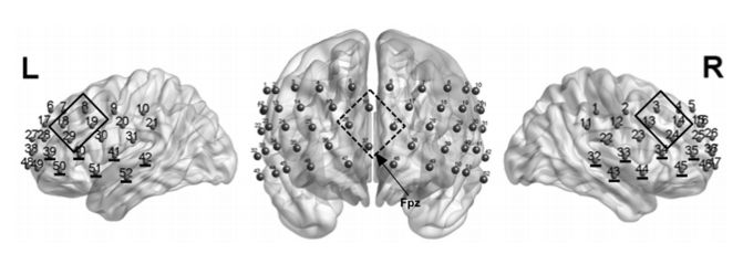 圖2:具有測量通道的fNIRS探頭的定位。興趣區(qū)通道:雙側(cè)背外側(cè)前額葉皮層(DLPFC,連續(xù)框架;左8、18、19、29通道,右3、13、14、24通道),