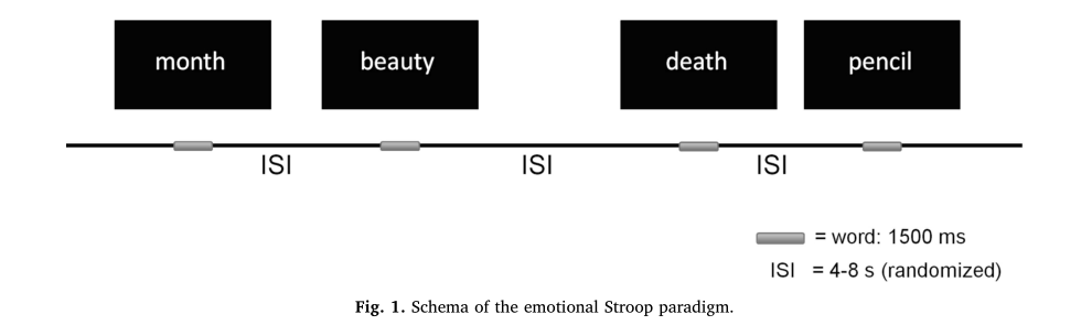 情感Stroop任務(wù)包括10個中性詞組(如月、鉛筆)、10個積極詞組(如美麗、春天)和10個消極詞組(如噩夢、死亡),這些詞是與任何特定的精神病理學(xué)無關(guān)的詞。使用刺激呈現(xiàn)軟件將每個詞以紅、綠、藍(lán)、黃四種顏色顯示在黑色的電腦屏幕上。單詞通過事件相關(guān)設(shè)計(jì)隨機(jī)呈現(xiàn),刺激間隔在4到8秒之間變化。每個單詞的呈現(xiàn)時間為1500毫秒,在此之前有一個白色的固定交叉顯示500毫秒(圖1)。在刺激呈現(xiàn)后,參與者必須通過按鍵盤上相應(yīng)的顏色鍵來盡可能快地說出單詞的顏色。當(dāng)按下與另一種顏色對應(yīng)的鍵,而不是屏幕上顯示的顏色時,就會記錄一個錯誤。在實(shí)際任務(wù)之前,參與者通過命名20個無意義的字母X的顏色來練習(xí)顏色按鈕的對應(yīng)關(guān)系。