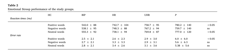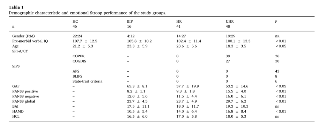 參與者被分為四組:精神病高危組(HR)、精神病超高高危組(UHR)、雙相情感障礙高危組(BIP)和健康對照組(HC)。(表1)