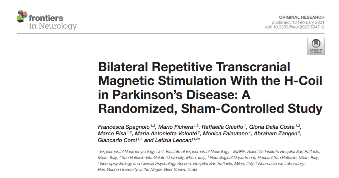 2021年,國(guó)外研究團(tuán)隊(duì)使用H線圈,對(duì)帕金森病患者進(jìn)行了一項(xiàng)隨機(jī)、雙盲、安慰劑對(duì)照研究,來評(píng)價(jià)高頻rTMS聯(lián)合H線圈實(shí)現(xiàn)DTMS治療PD的安全性和有效性,研究成果發(fā)表在《Frontiers in Neurology》上。