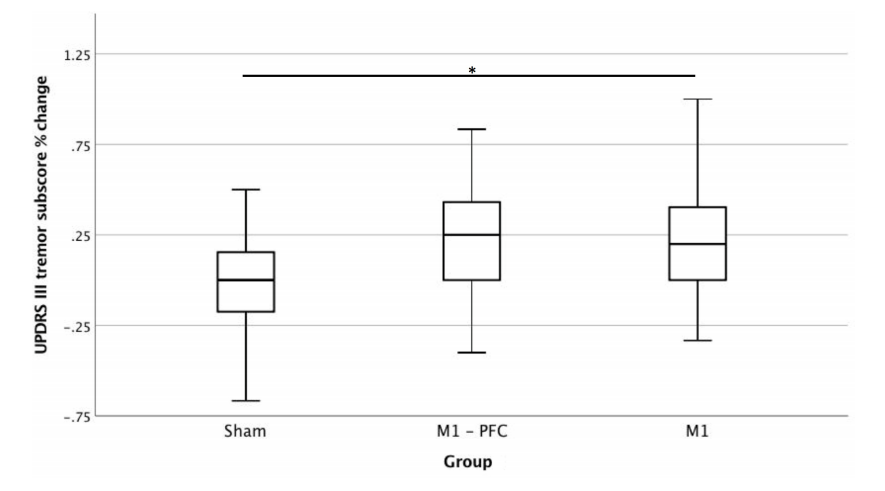 統(tǒng)一帕金森病分級(jí)量表(UPDRS)第三部分T2期震顫亞評(píng)分與基線相比百分比的變化。將M1-PFC和M1合并得到真實(shí)組。