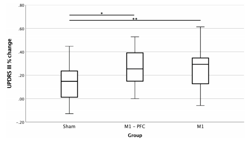 統(tǒng)一帕金森病評(píng)定量表(UPDRS)第三部分T2時(shí)與基礎(chǔ)評(píng)分相比百分比的變化。將M1-PFC和M1合并得到組群真實(shí)組。