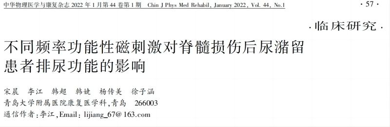 宋晨,李江,韓超,韓婕,楊傳美,徐子涵.不同頻率功能性磁刺激對脊髓損傷后尿潴留患者排尿功能的影響[J].中華物理醫(yī)學(xué)與康復(fù)雜志,2022,44(1):57-61.