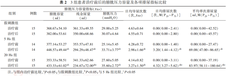 而20Hz在逼尿肌收縮的同時有尿道括約肌松弛現(xiàn)象,這使得逼尿肌與括約肌更協(xié)調(diào)地利于患者排尿,從而導(dǎo)致20Hz組患者的殘余尿量減少,日均排尿次數(shù)增多及單次排尿量增加。