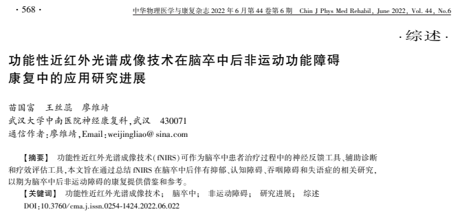 2022年,武漢大學(xué)中南醫(yī)院廖維靖教授研究團(tuán)隊(duì),對fNIRS在該方面的研究進(jìn)行了綜述,發(fā)表在《中華物理醫(yī)學(xué)與康復(fù)雜志》上。