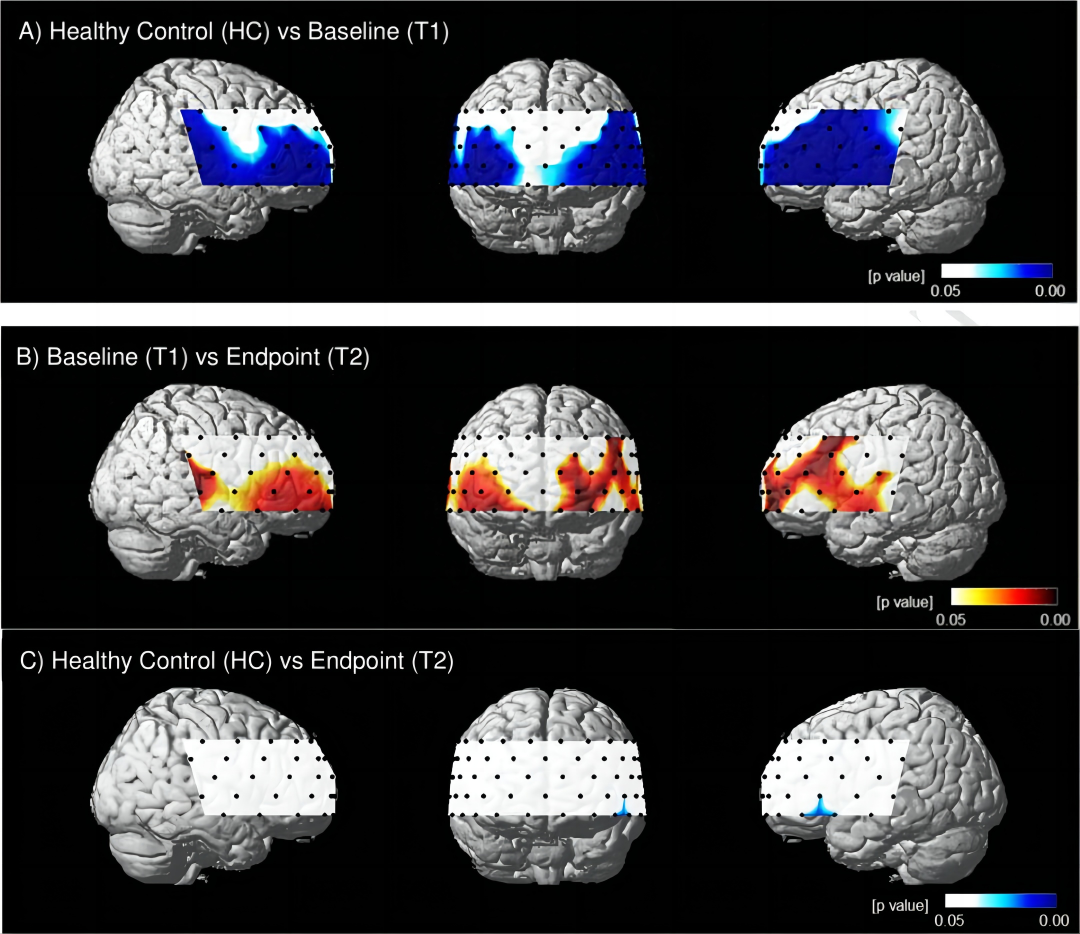 4、對抑郁癥采取電休克治療(ECT)的療效和耐受性已被廣泛認同,但ECT對大腦功能的直接影響尚不清楚。Hirano等人[4]的一項研究闡明了ECT后皮層功能反應(yīng)對認知任務(wù)的變化。研究使用了fNIRS來檢測30例重度抑郁癥或雙相抑郁患者在ECT治療前后與108名健康對照者(HC)的變化。結(jié)果與HC組相比,發(fā)現(xiàn)在ECT之前,患者的雙側(cè)額葉皮質(zhì)在VFT中顯示出[oxy-Hb]值明顯降低。而在ECT之后,患者組的雙側(cè)額葉皮質(zhì)在VFT中的[oxy-Hb]值明顯增加,且與HC組無太明顯差異。因此,額葉區(qū)功能對認知任務(wù)的異常反應(yīng)可能與ECT治療抑郁癥的療效有關(guān)。