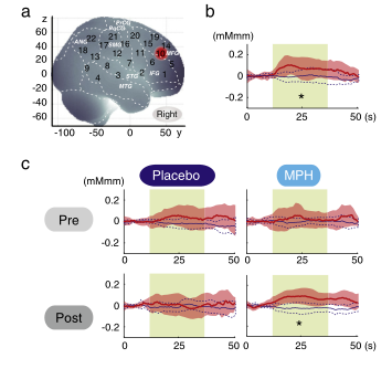 3、Monden等人[3]通過fNIRS測量12名注意缺陷多動障礙(ADHD)兒童在服用哌甲酯(MPH)前后1.5小時,被試進行GO/NO-GO任務(wù)時的外側(cè)前額葉皮質(zhì)血流變化。結(jié)果發(fā)現(xiàn)在MPH攝取前,患者的外側(cè)前額葉皮質(zhì)(LPFC)沒有顯著的激活。在MPH攝入后,患者的右外側(cè)前額葉皮質(zhì)檢測到[oxy-Hb]的顯著增加。研究結(jié)果表明認知能力的改善與右側(cè)LPFC的激活有關(guān),LPFC可作為監(jiān)測ADHD兒童服用MPH效果的生物標志。
