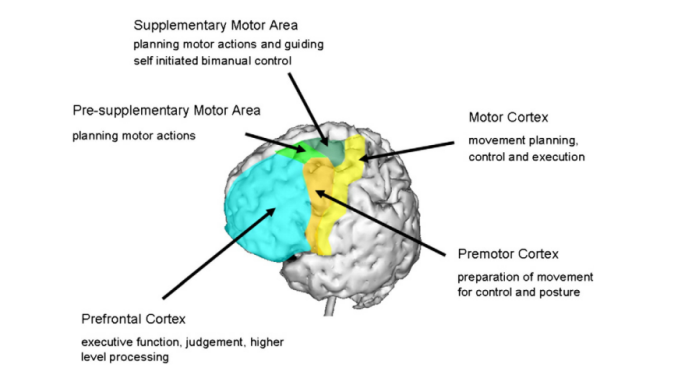 由于人類皮層的運(yùn)動(dòng)區(qū),即初級(jí)感覺運(yùn)動(dòng)皮層(primary sensory - motor cortex, PSMC)和運(yùn)動(dòng)前皮層(pre - motor cortex, PMC)位于離頭皮組織較近的位置,因此很容易進(jìn)行光學(xué)測量。此外,用于復(fù)雜運(yùn)動(dòng)學(xué)習(xí)和運(yùn)動(dòng)控制的高級(jí)加工(如判斷、規(guī)劃、錯(cuò)誤檢測)的前額葉皮層(PFC)也可以通過fNIRS快速獲取。圖1為在三維解剖MRI圖像上描繪的人類大腦皮層中每個(gè)運(yùn)動(dòng)相關(guān)區(qū)域的大致位置。
