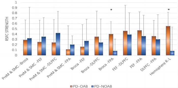 3、雙樣本t檢驗顯示,PD-OAB組雙側(cè)Broca區(qū)(P=0.027)、FPA-L和Broca-R(P=0.006)、以及兩側(cè)半球(P=0.043)之間的靜息態(tài)功能連接(RSFC)強度顯著增加;當合并雙側(cè)ROI時,F(xiàn)PA和Broca區(qū)(P=0.032)之間RSFC強度顯著增加,具體見圖4、5。