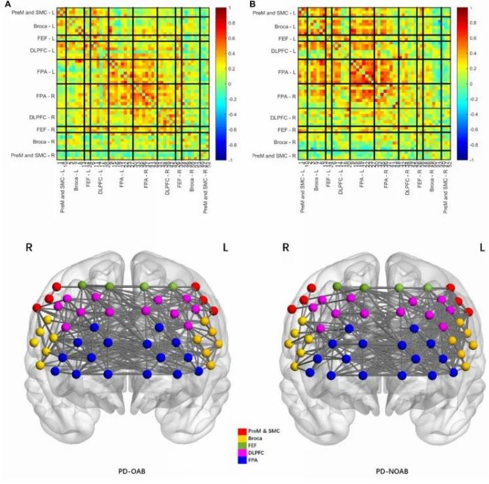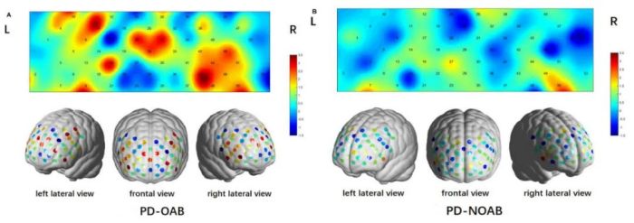 2023年,來自上海交通大學醫(yī)學院附屬新華醫(yī)院神經(jīng)內(nèi)科侯媌媌團隊在《Frontiers in neuroscience》雜志上發(fā)表了一項利用近紅外腦功能成像技術(shù)(functional near infrared spectroscopy,fNIRS)比較PD伴OAB和不伴OAB患者的前額葉皮層激活差異和腦網(wǎng)絡連接差異的研究。