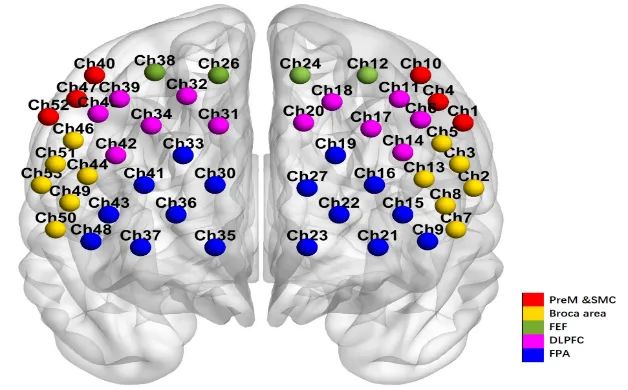 采用武漢資聯(lián)虹康科技有限公司的53通道BS7000近紅外腦功能成像系統(tǒng)監(jiān)測靜息態(tài)和整個VFT范式的執(zhí)行中大腦皮層的血氧變化,近紅外傳感器遵循國際腦電10-20系統(tǒng)標準排布,通道覆蓋雙側(cè)前額葉背外側(cè)區(qū)(DLPFC)、雙側(cè)額極區(qū)(FPA)、雙側(cè)前運動皮層和輔助運動皮層(PreM和SMC)、雙側(cè)布洛卡區(qū)(Broca)、雙側(cè)額眼區(qū)(FEF)具體排布如下圖。