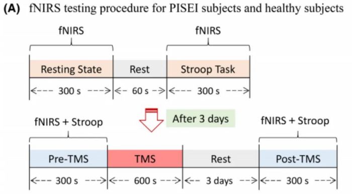 研究采用單盲、隨機(jī)對照設(shè)計(jì),分別采用fNIRS檢測16名PISEI患者和16名健康受試者在靜息狀態(tài)和Stroop任務(wù)下的血流動力學(xué)差異。3天后,所有受試者均接受單次TMS干預(yù),并在TMS干預(yù)前和干預(yù)后3天進(jìn)行Stroop任務(wù)的fNIRS測試。fNIRS檢測流程如圖: